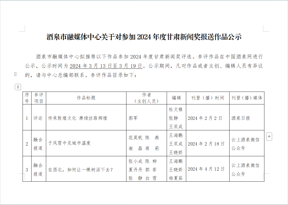 凯时尊龙市融媒体中心关于对参加2024年度甘肃旧事奖报送作品公示