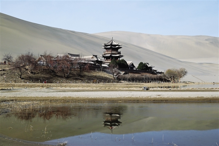 近日,随着气温回升,沙漠奇观敦煌市月牙泉冰消泉开,碧水荡漾,一只大白鹭来此“打卡”,成为景区一道新景。