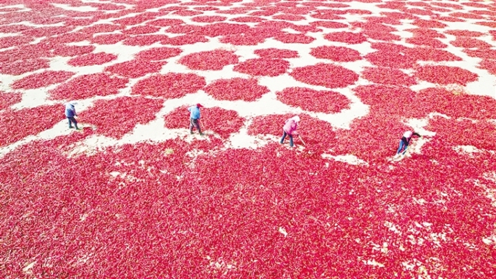 连日来,肃州区三墩镇的农户利用晴好天气晾晒、搬运、分拣丰收的辣椒,构成了一道独特的风景。
