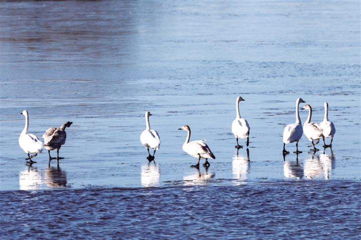 玉门赤金峡,黑鹳翩跹而至;金塔黑河边,天鹅翩然游弋;甘肃盐池湾国家级自然保护区,绿头鸭破冰嬉戏……
