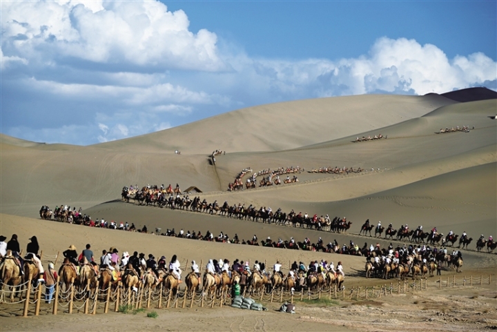 初秋,敦煌市鸣沙山月牙泉景区风光如画、景色诱人,吸引众多游客前来欣赏大漠风光。